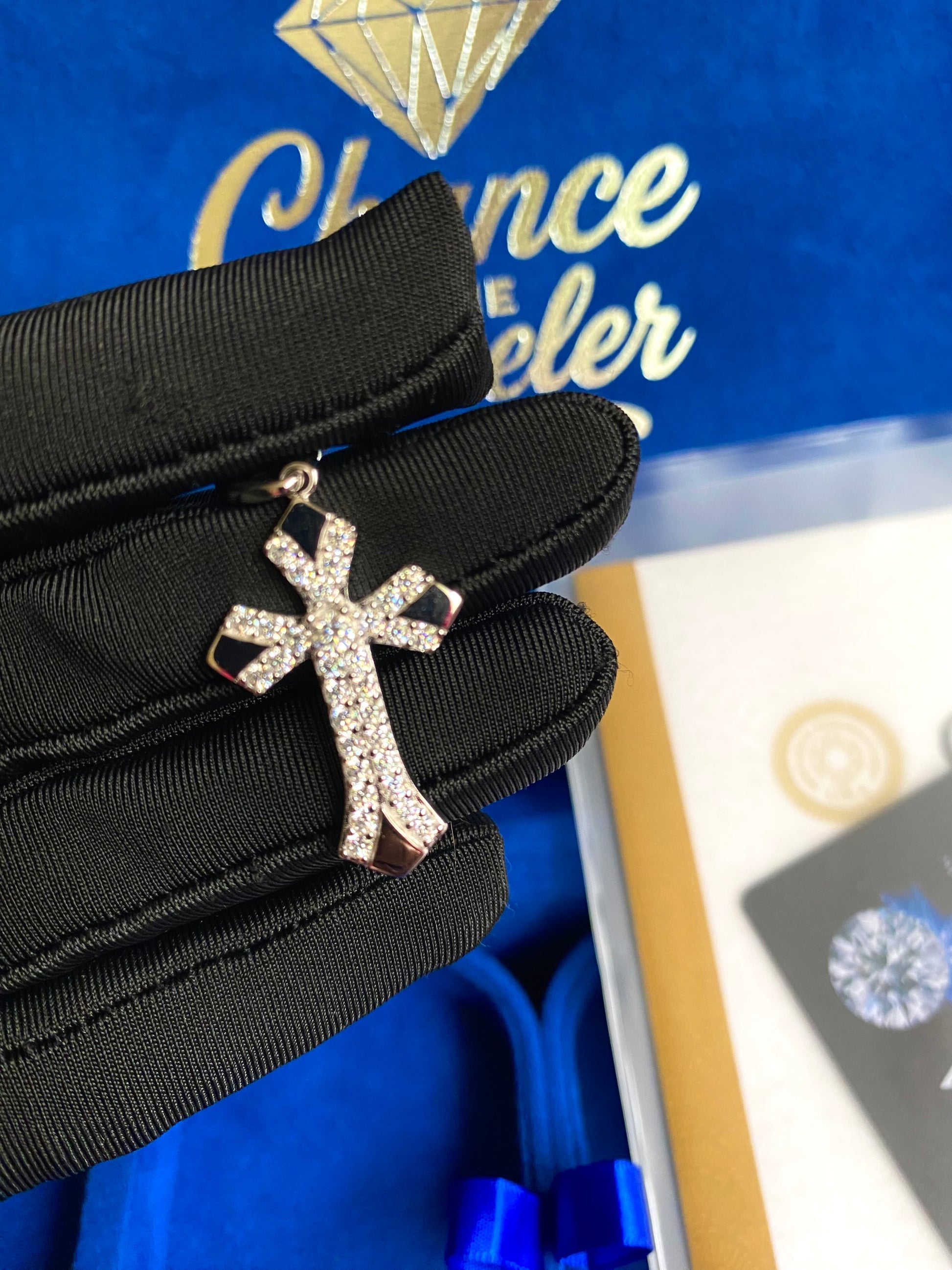 Shine like never before. This Exclusive Moissanite Cross Pendant is made with solid 925 sterling silver and features D-color, VVS moissanite stones — each one guaranteed to pass a diamond tester.